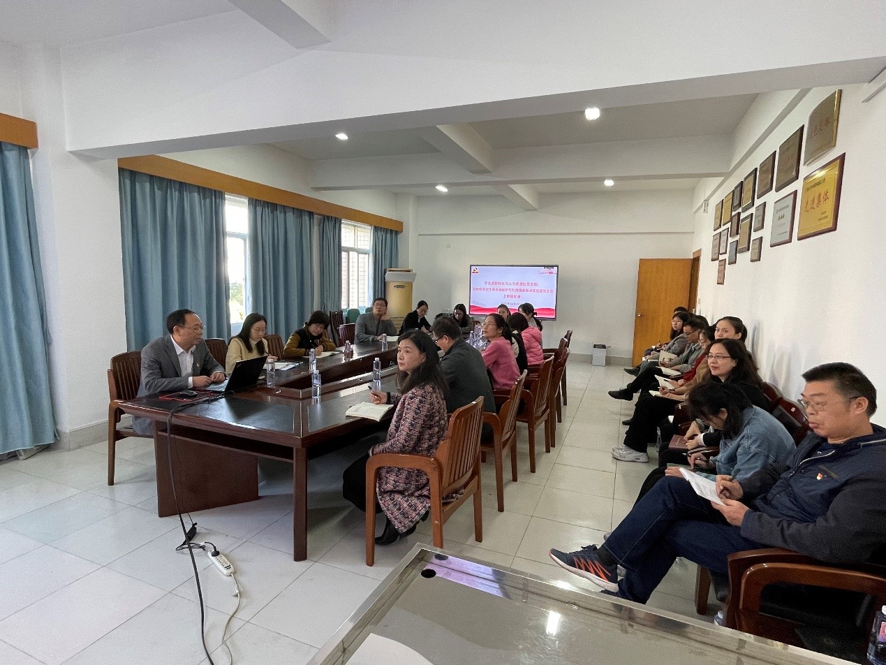 2023年12月29日,人力资源处党支部开展关于主题教育和业务工作相结合学习系列活动(十),于文进副校长为人力资源处党支部、亚热带农业生物资源保护与利用国家重点实验室直属党支部作了题为《深入学习贯彻习近平总书记视察广西时的重要讲话精神》的专题党课。