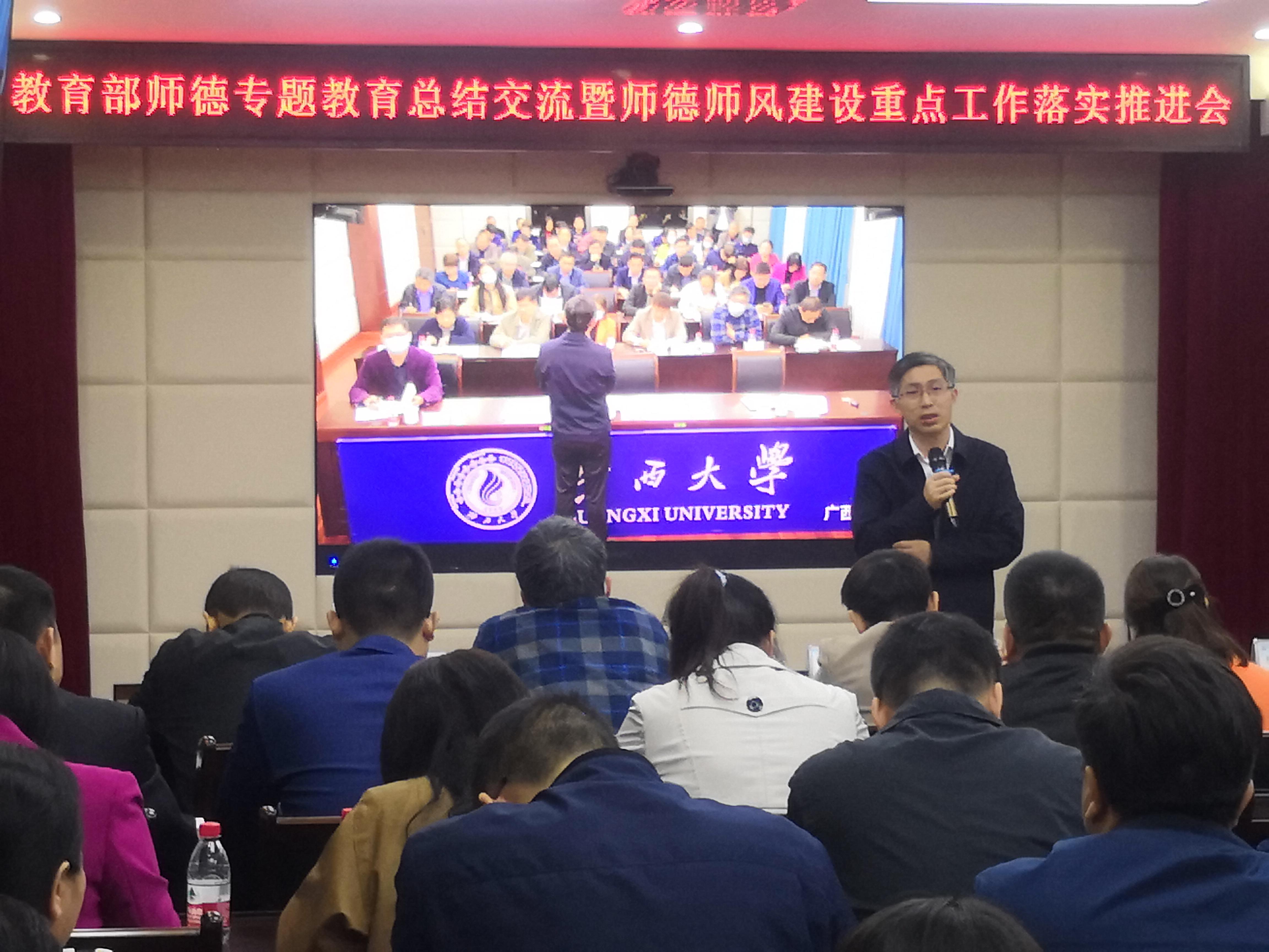 会后,我校就贯彻落实本次会议精神及下一步推进教师思想政治工作和师德专题教育进行部署。马少健在部署会上指出,教师思想政治和师德师风建设工作是凝心铸魂、立德树人的基础性工程,各单位要切实增强做好教师思政和师德师风建设工作的思想自觉和行动自觉。要认真组织学习,不折不扣落实本次会议精神。要突出政治建设,着力提升教师思想政治素质。要及时查缺补漏,完成师德专题教育各项任务。要做好系统总结,提炼专题教育工作亮点特色。要加强部门联动,协同推进全校师德师风建设。
